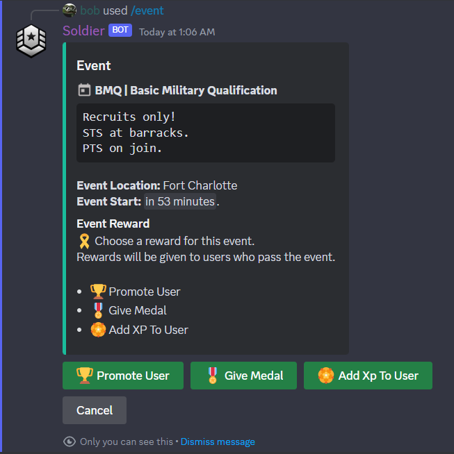 Promote User- Promotes the user to the next rankGive Medal- Adds some specified medals to the userAdd Xp To User- Adds a specified amount of xp to the user
